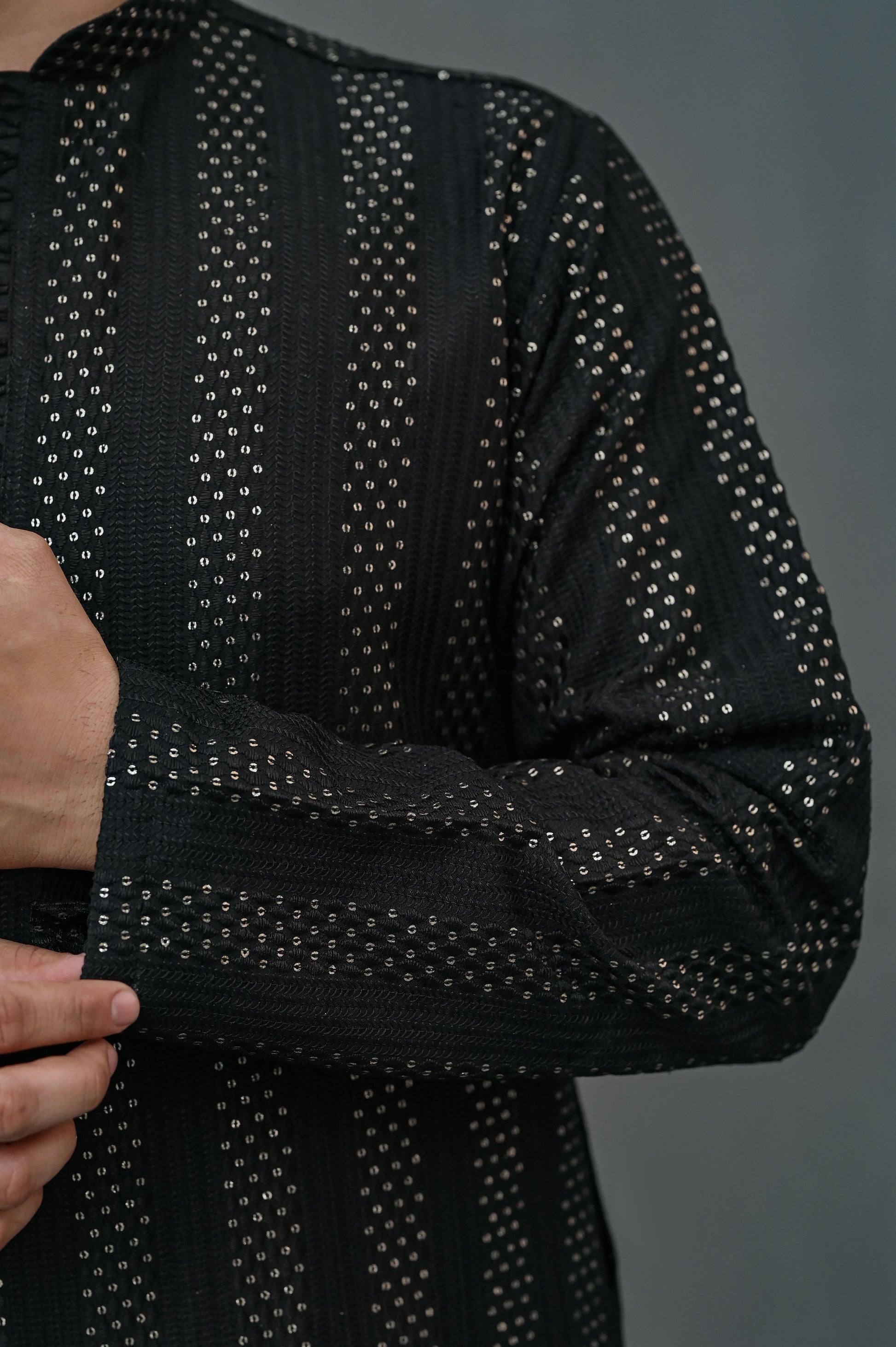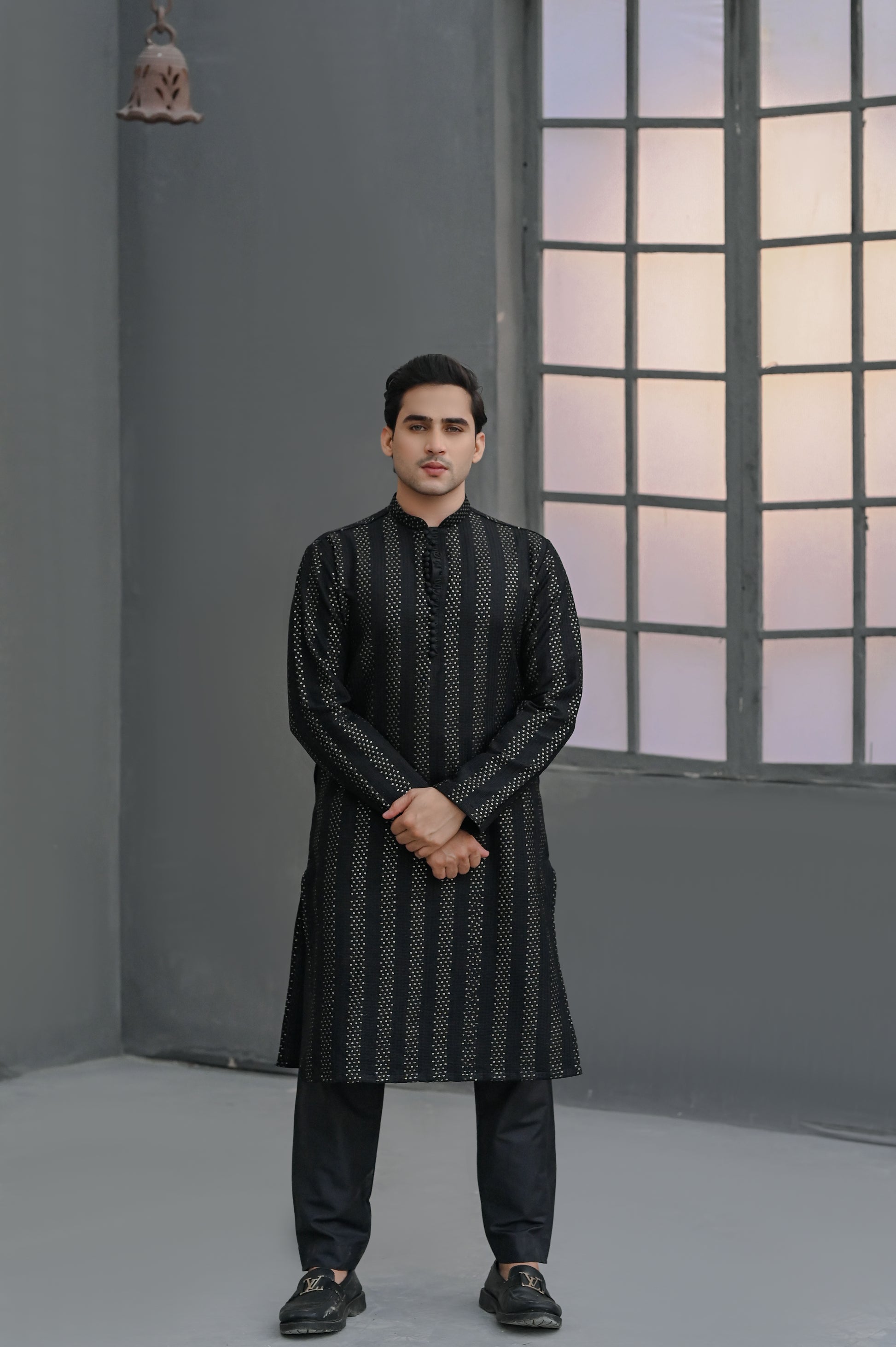Raheel Qadir – Black Embroidered Kurta Pajama is crafted with timeless sophistication. The deep black hue, elevated with elegant embroidery, gives this outfit a bold and graceful presence. Perfectly blending tradition with modern tailoring, it’s an essential choice for weddings, festive gatherings, and formal occasions.