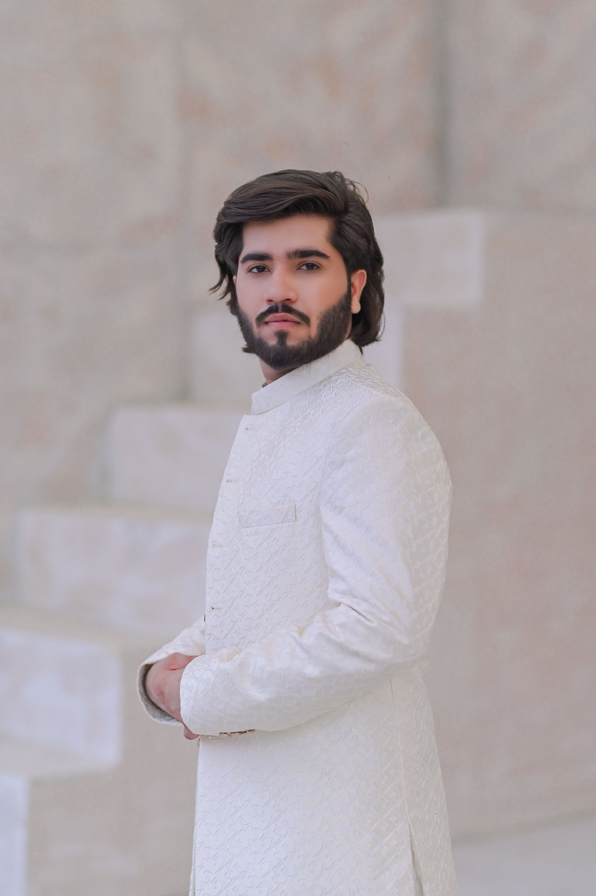 Exude sophistication with the Raheel Qadir Ivory White Kurta Pajama, complemented by a Cream Prince Coat featuring elegant embroidered work. The graceful color combination and fine detailing make this ensemble an excellent choice for weddings, festive occasions, and formal gatherings.