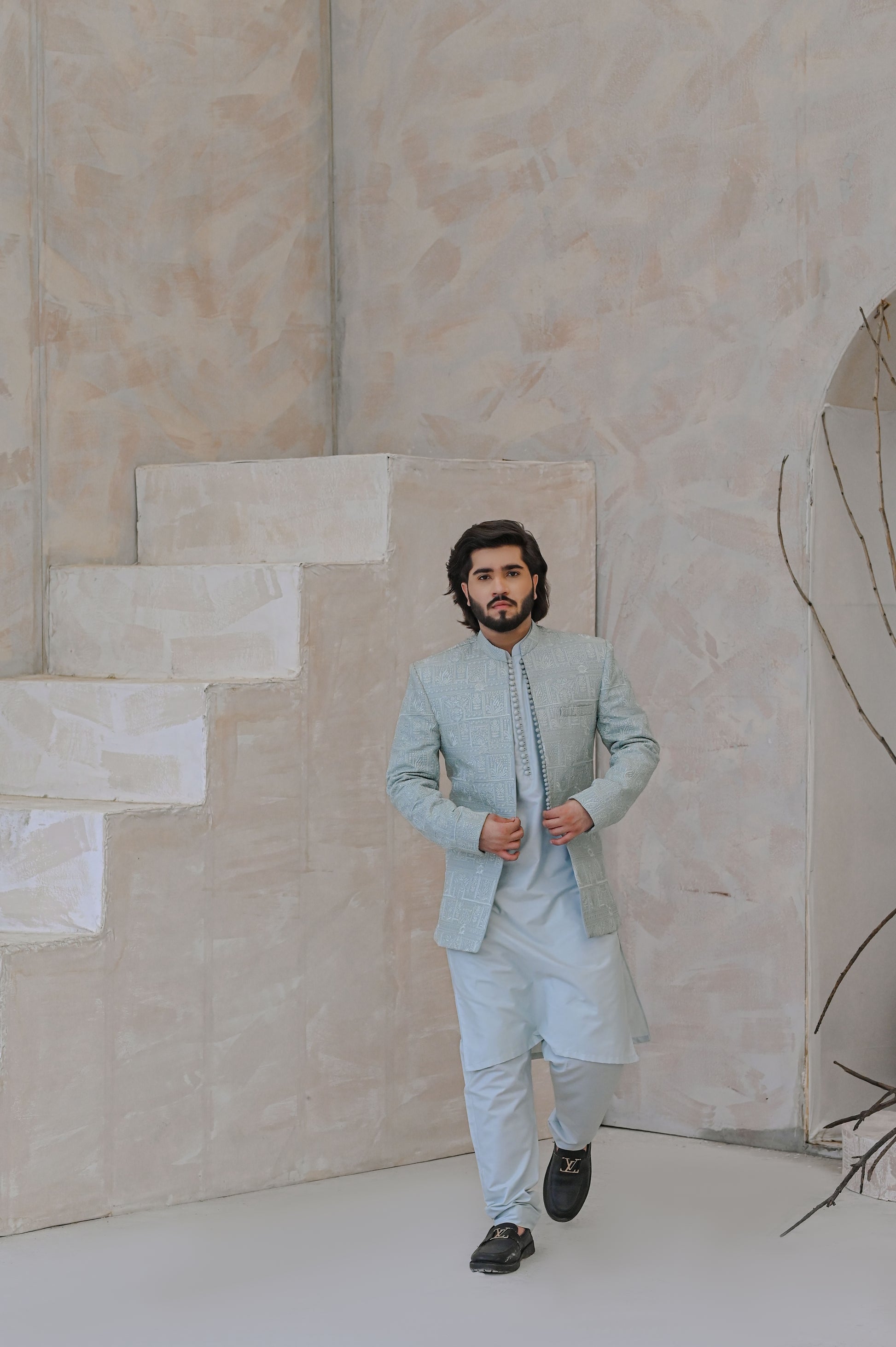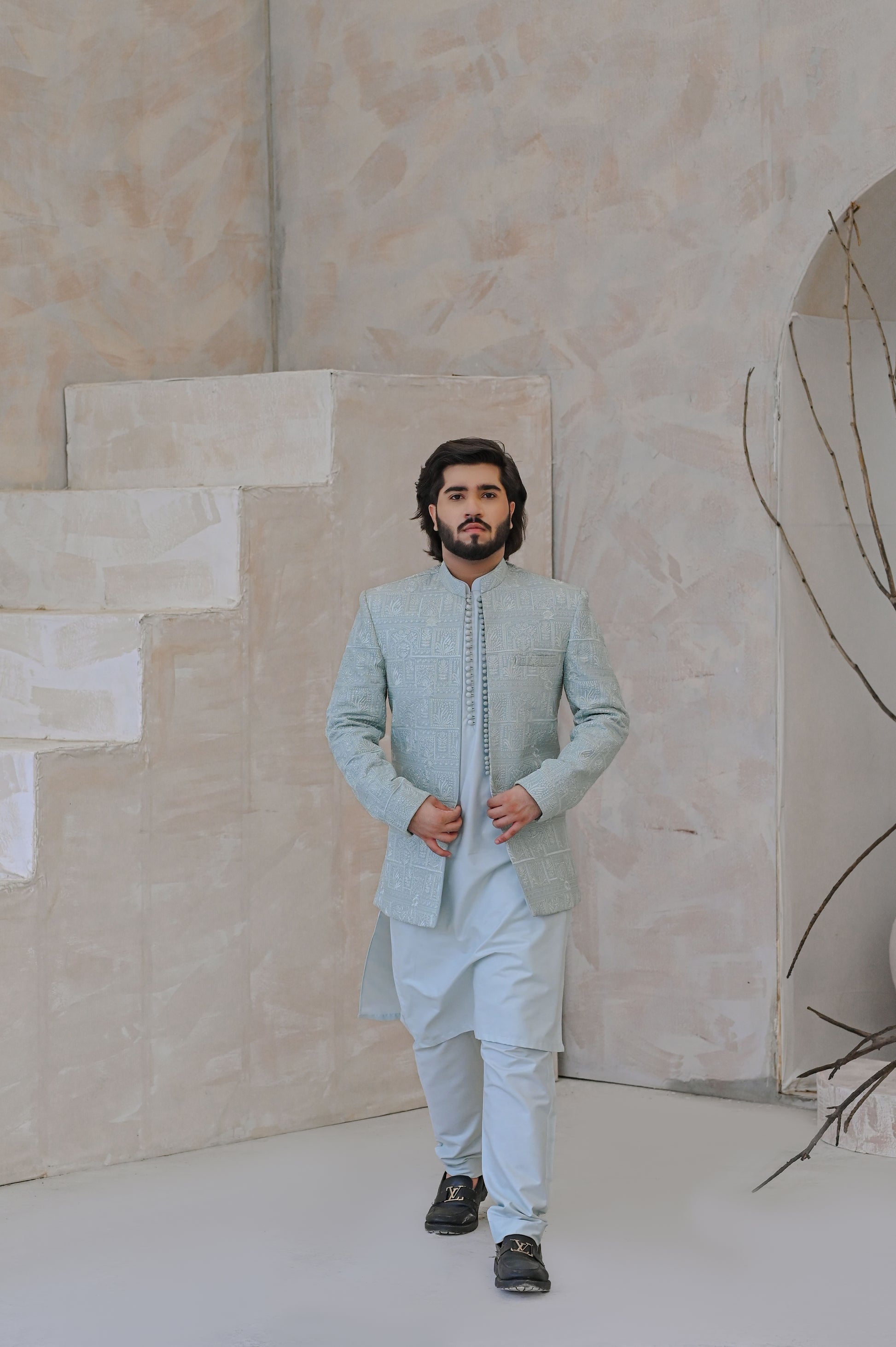 Raheel Qadir – Light Blue Kurta Pajama with Machine Embroidered Prince Coat