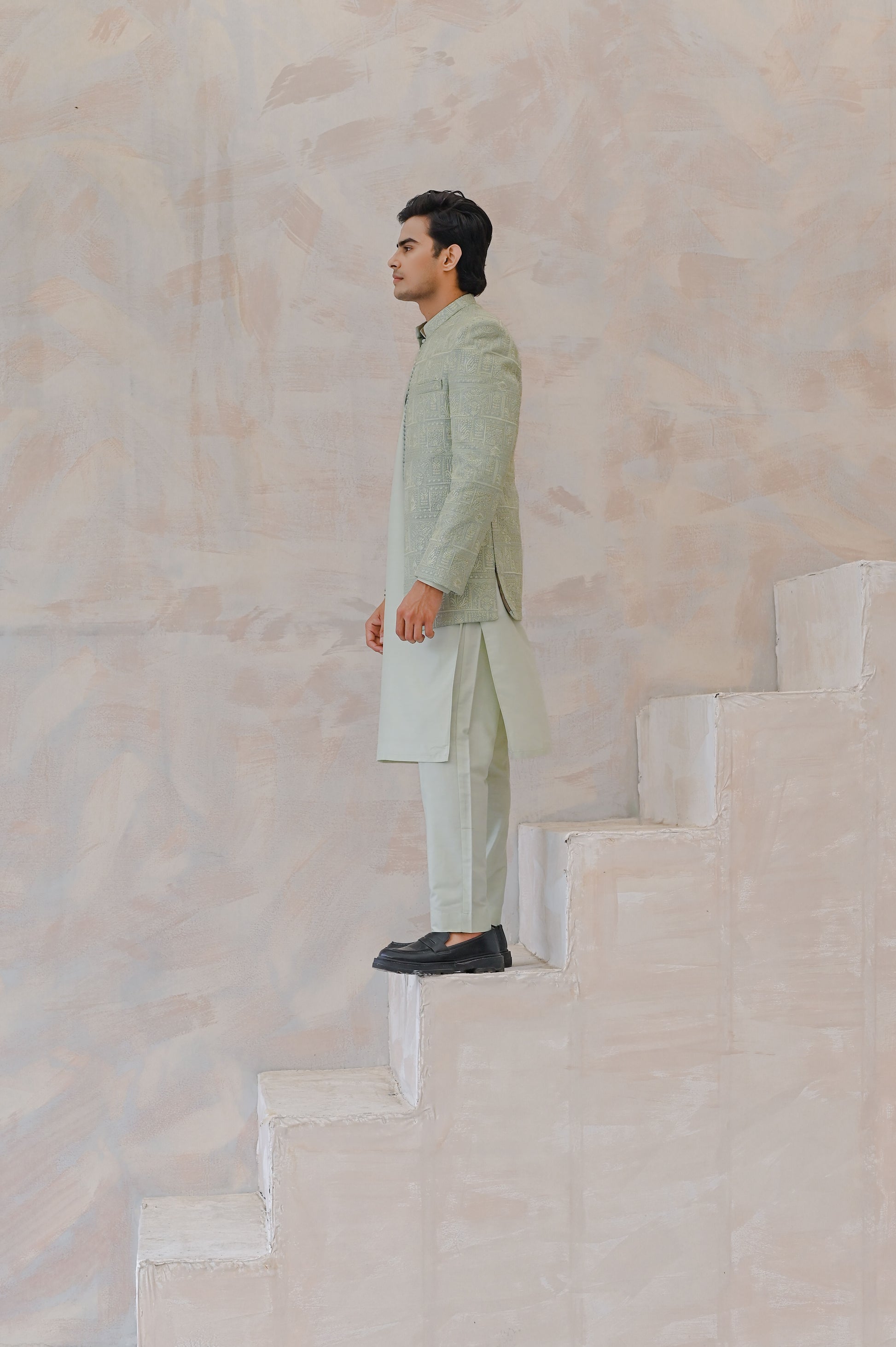 Raheel Qadir – Mint Green Kurta Pajama with Machine Embroidered Prince Coat
