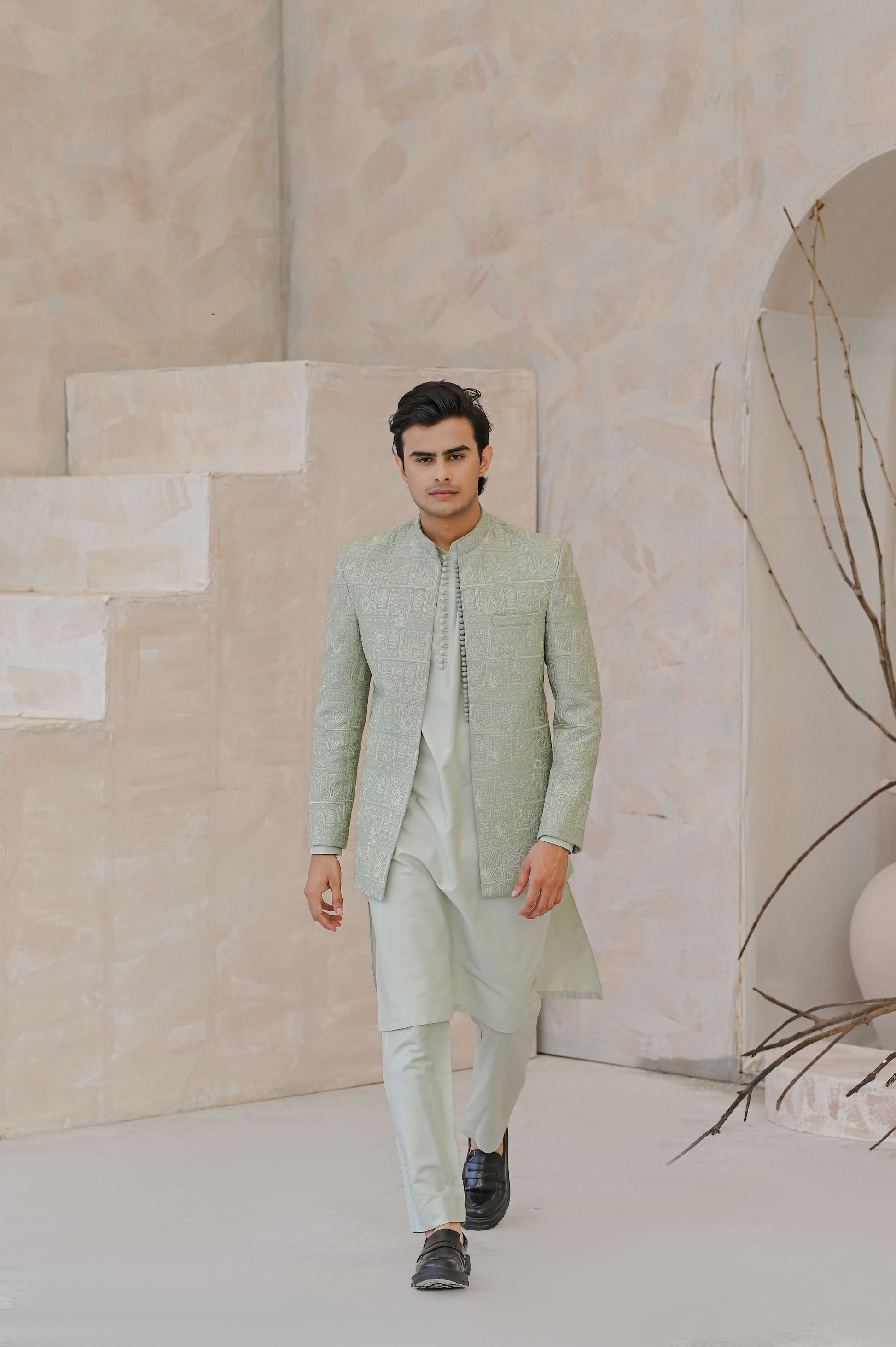 Add grace to your wardrobe with the Raheel Qadir Mint Green Kurta Pajama, complemented by a Prince Coat featuring detailed machine embroidery. Crafted with premium fabric and a refined finish, this ensemble blends traditional elegance with modern sophistication—perfect for weddings, festive events, and formal gatherings.