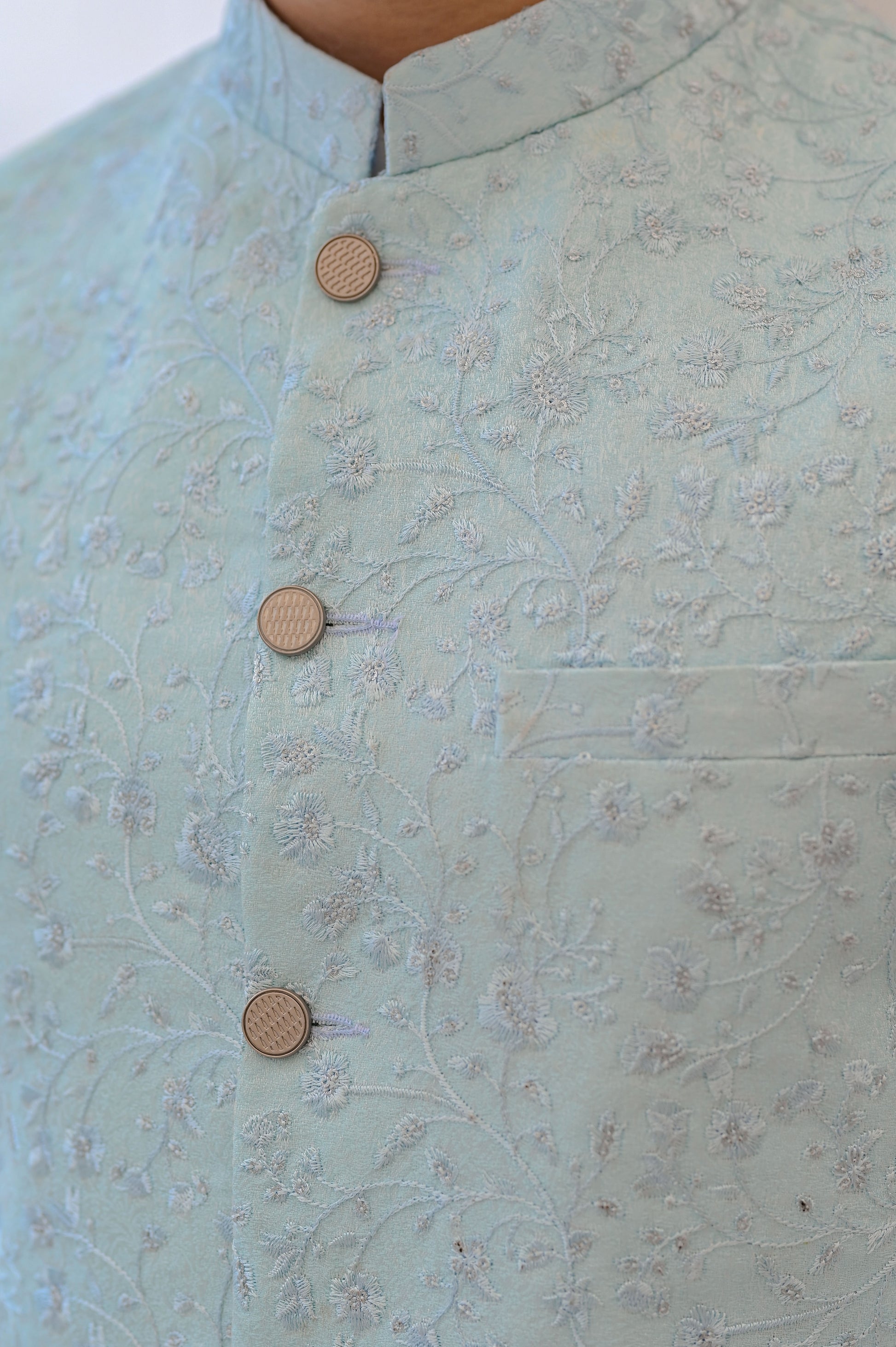 Color: Off-White Kurta Pajama with Sea Green Waistcoat